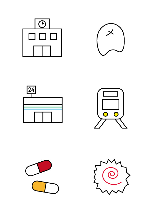 文字が読めない小さいお子さんやお年寄り(老眼?)の方にも伝わりやすいよう文字などはできるだけ使わず、また少し色味がある可愛らしい感じのピクタグラムにしてみました。