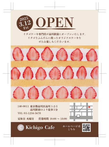 ・地図やお店の情報を配置しました。その他、ケーキの種類などの情報は、お店のHPにQRコードで読み取っていただけるようにして、新規OPNEであることをメインに作成しました。