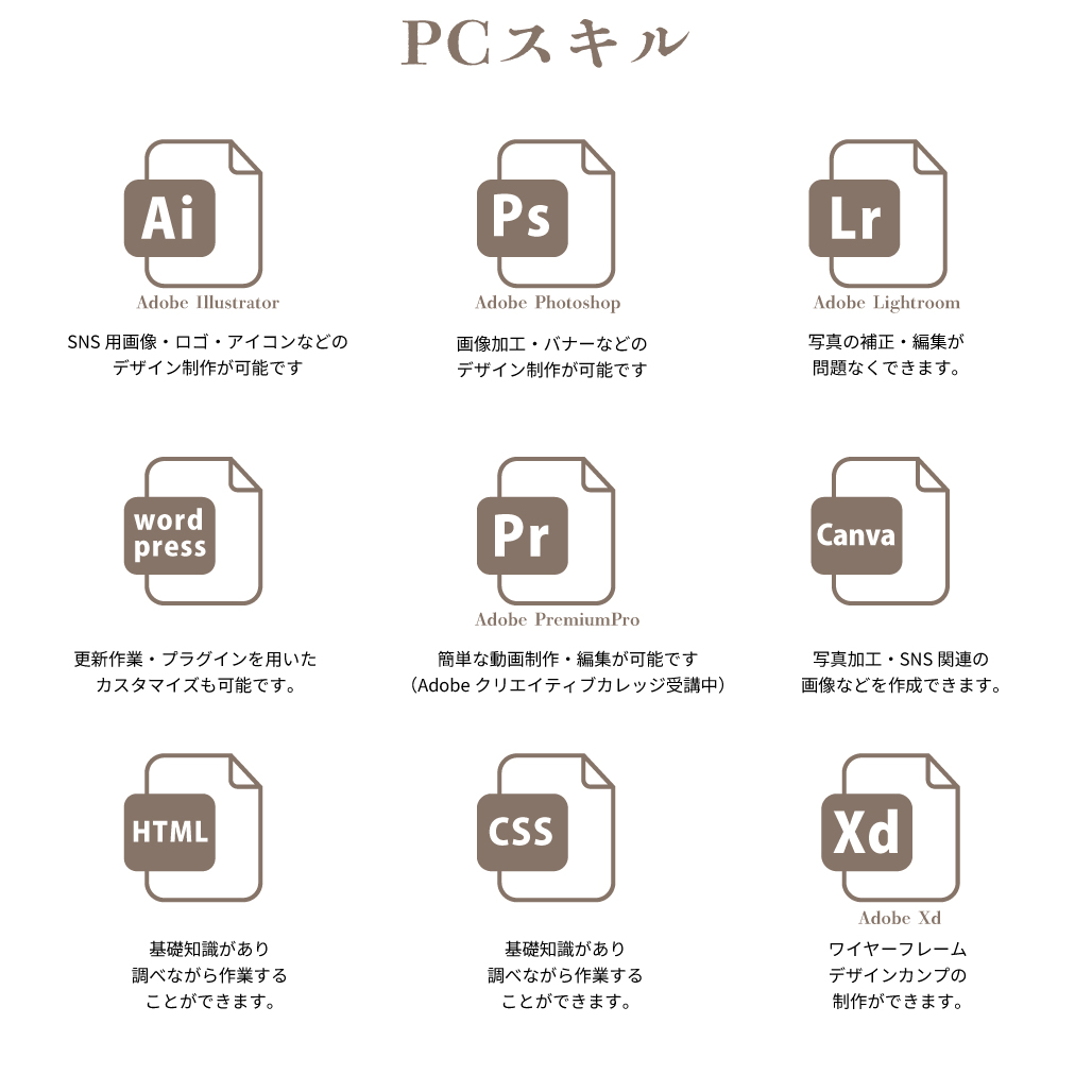 ◆習得スキル:Illustrator / Photoshop / Adobe XD / Premiere Pro / After Effects / WordPress / HTML / CSS
